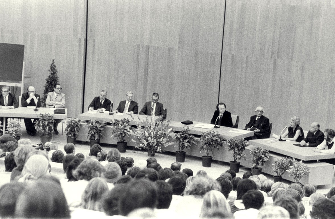 Panel interdisciplinaire du Centre d’épistémologie en juin 1976 : de g. à dr. : P. Gréco (psychologie), L. Apostel (logique) J. B. Grize (logique), I. Prigogine (physique), C. Nowinski (philosophie), E. Heer (physique), A. Munari (psychologie), J. Piaget (épistémologie), B. Inhelder (psychologie), P. Weiss (neurobiologie), S. Papert (informatique).